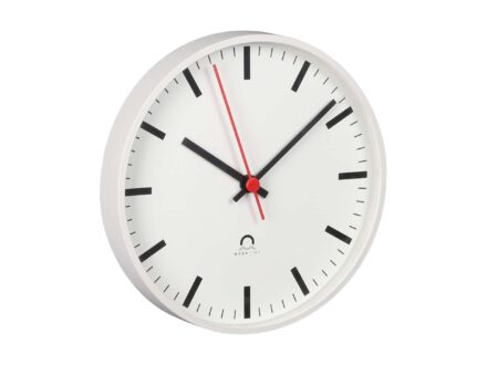Cette horloge présente un design moderne et fin. Les horloges double face sont constituées de deux horloges simple face assemblées par un support pour un montage au plafond ou au mur. Elles sont contrôlées et alimentées par la ligne MOBALine à deux fils ou par Ethernet/NTP/PoE.